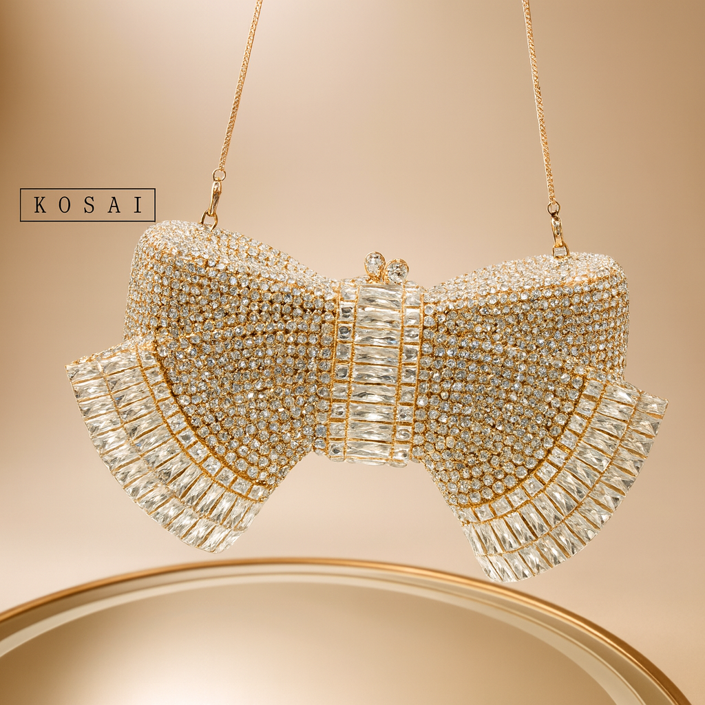 A bow-shaped blingy clutch is a fun and glamorous accessory that adds a playful touch to any outfit. Typically made from satin or sequined fabric, it features a prominent bow design at the front, often adorned with sparkling rhinestones or glittering embellishments. The clutch usually has a structured silhouette, making it easy to carry, and may include a detachable chain or strap for versatility. Perfect for evening events or parties, this clutch combines whimsy with elegance, making it a standout statement piece